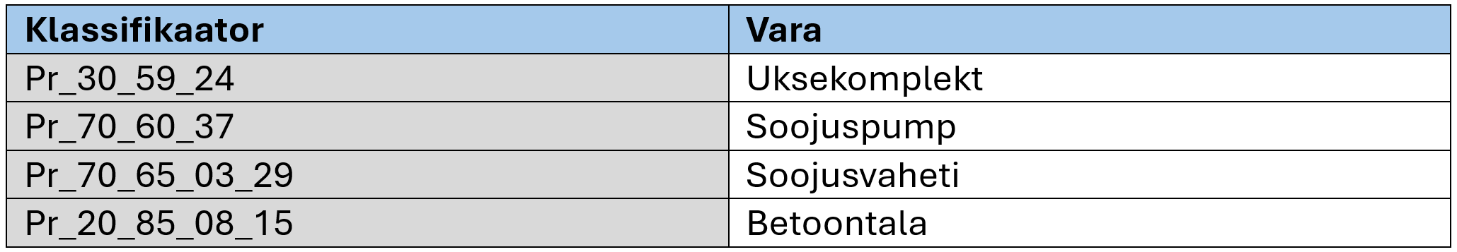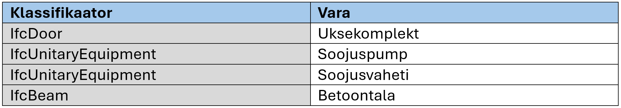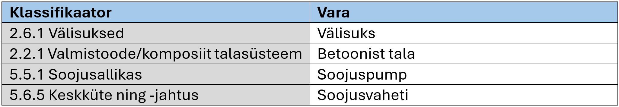 Järgnevalt on toodud mõned näited sarnastest varadest, mis on klassifitseeritud NRM-i, ARM-i ja Uniclass järgi.