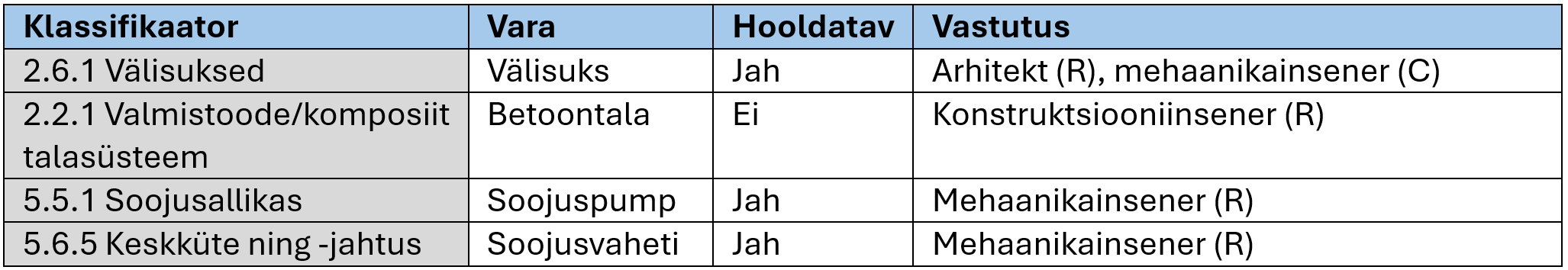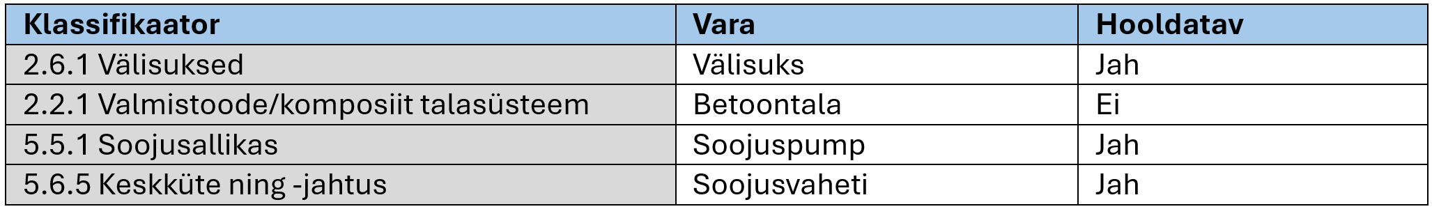 Tabel. Hooldatavate varade näidisnimekiri. Ukse juures on rõhuasetus selle lukukomplektil, ventilatsioonirestidel.