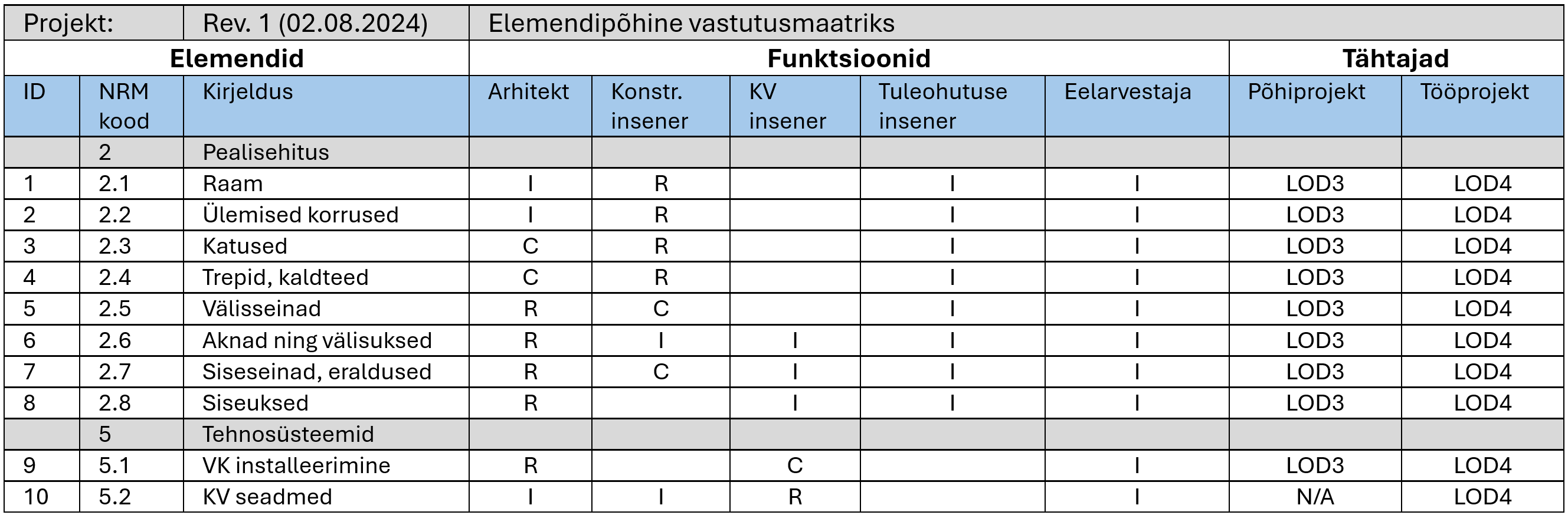 Alljärgnevalt näide elemendipõhisest vastutusmaatriksist, mis põhineb standardil RICS New Rules of Measurement (NRM).