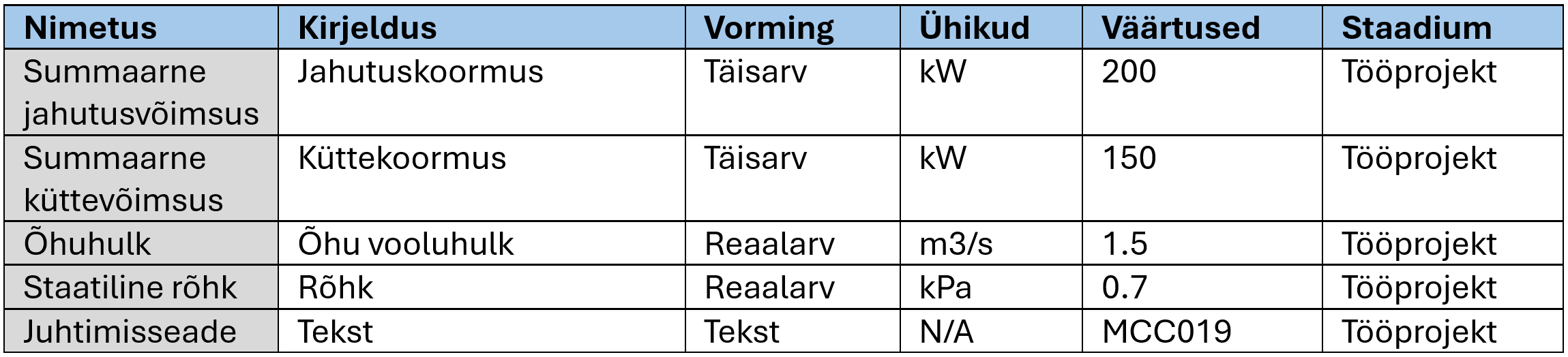 Tabel. Lisaomadused keskkütte- ja jahutusseadmetele (näide).