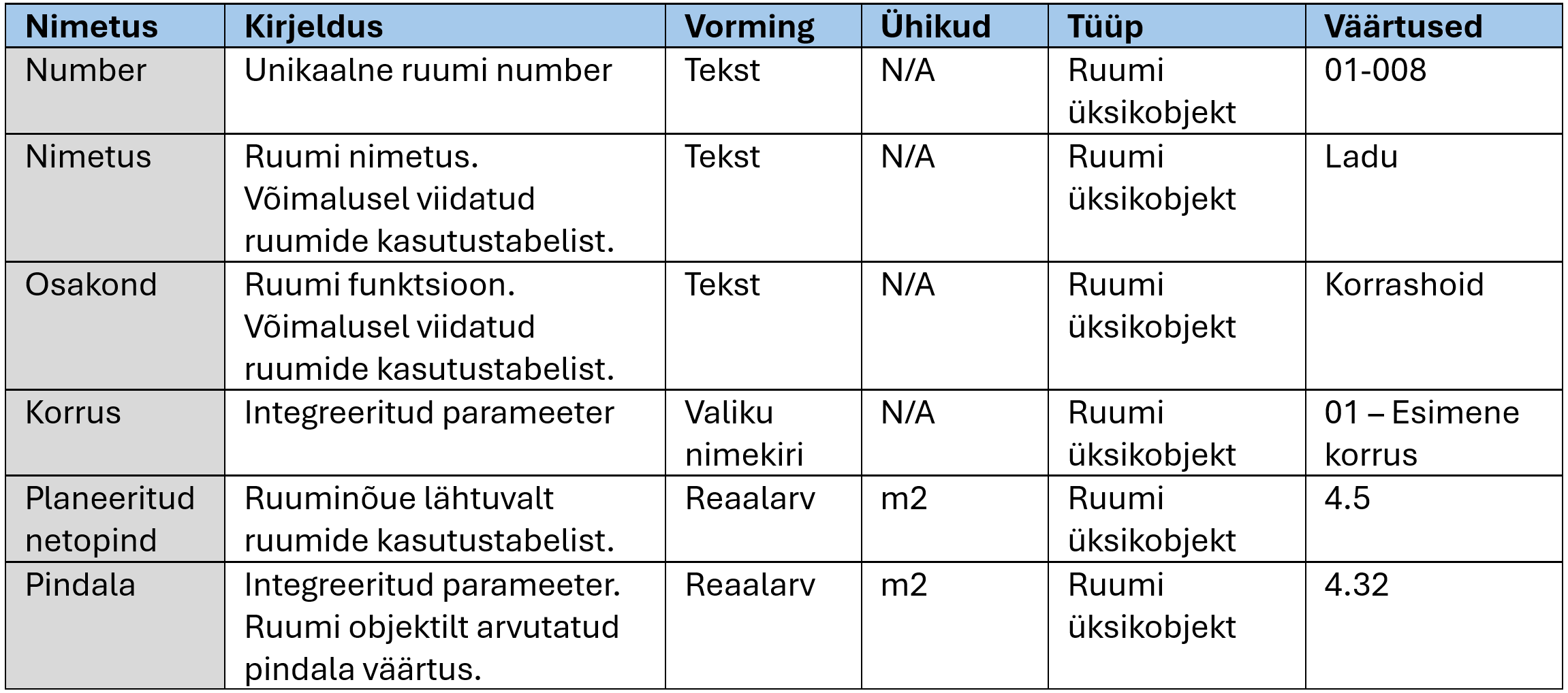 Tabel. Ruumide näide.