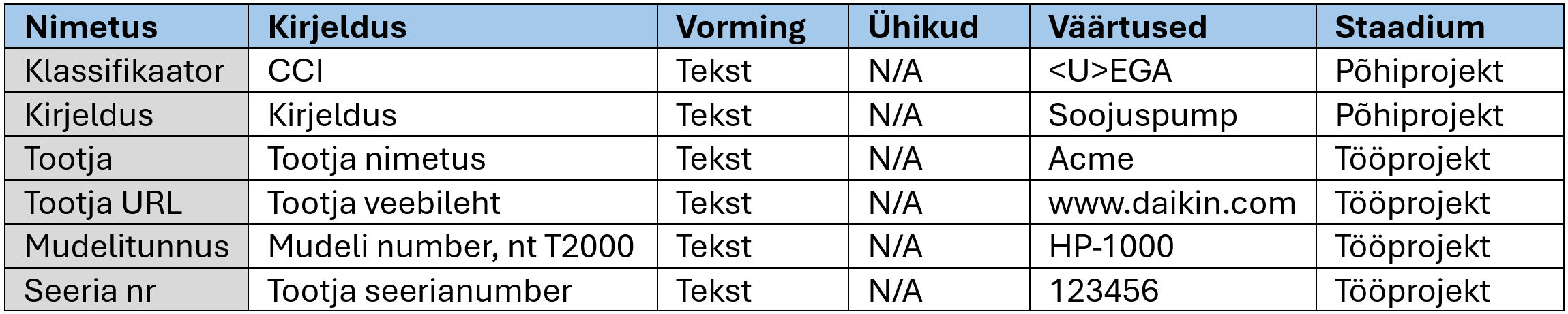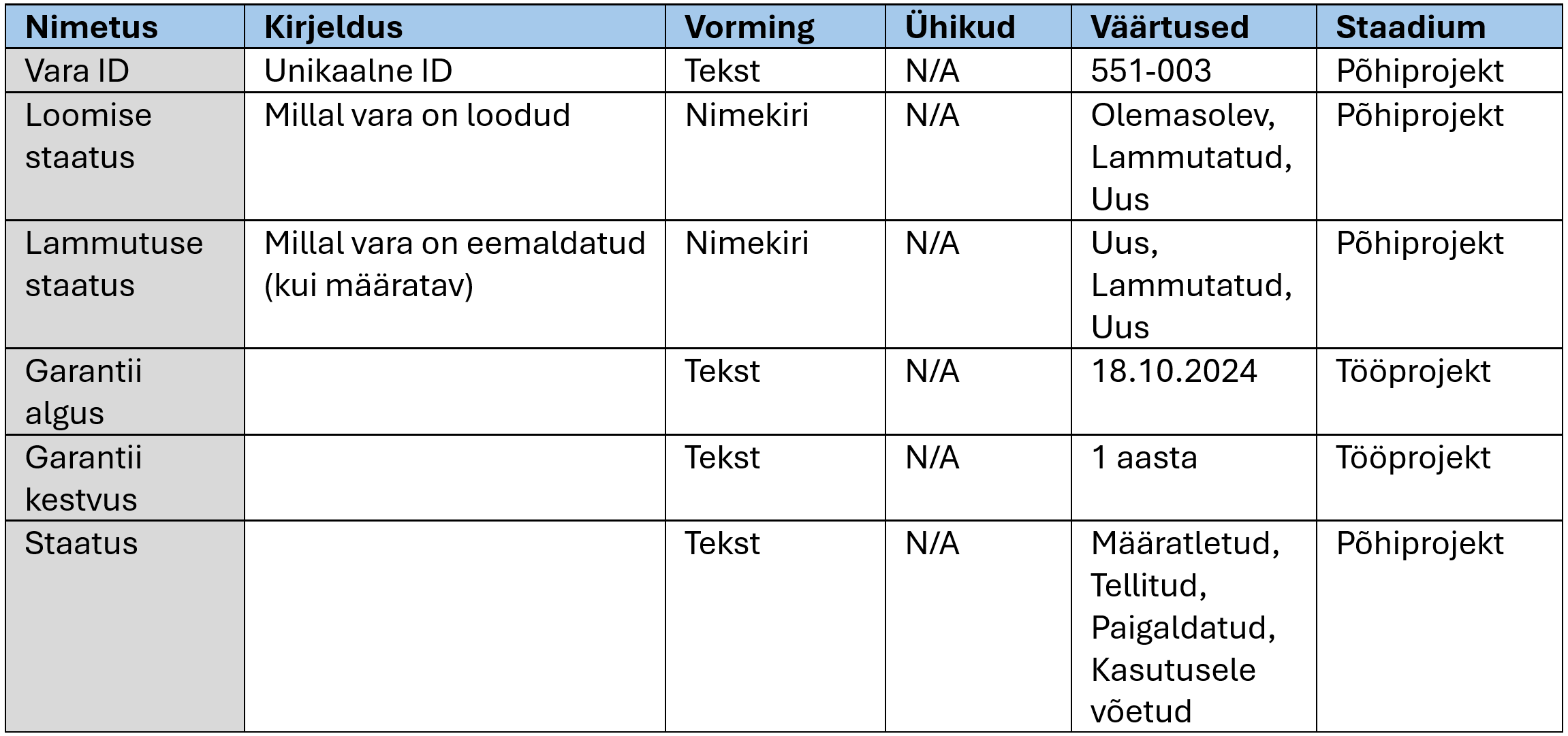 Tabel. Vara üksikobjekti parameetrite näide.