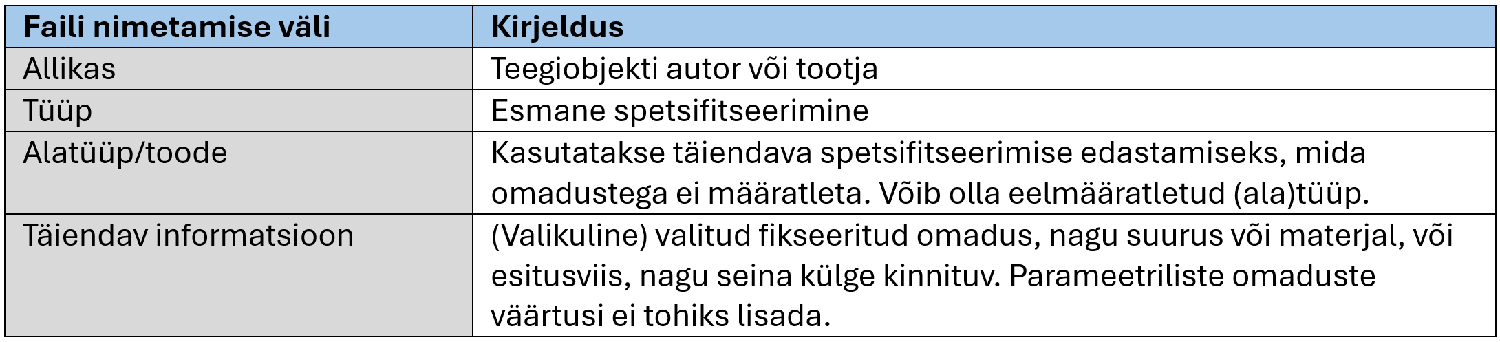 - Kõigi mudelite atribuutandmete standardne nimetamiskokkulepe, mis põhineb ühel jagatud parameetrite failil (mallil), mis sisaldab võimaluse korral IFC ja COBie nimetamise kokkuleppeid.