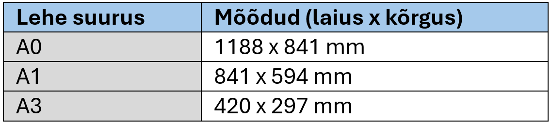 Tabel. Standardsed lehe suurused.