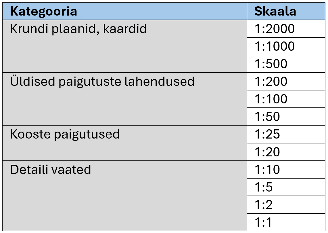 Kõik joonised peavad sisaldama vaateid ühes järgmistest mõõtkavadest. Kui joonise lehe vaade sisaldab mitut vaadet, tuleks skaala lisada vaate pealkirjale. Projektides kasutatakse lehtede mallidel põhinevaid lehti, mis esitatakse pärast määramist / lepingut projekti CDE kaudu.