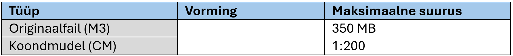 - kõik mudeliandmed tuleks luua mõõtkavas 1:1 (täissuuruses) mudeliruumis ja vastavalt nende standarditele;