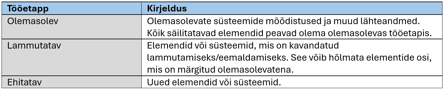 Näiteks võib mõõdistusmudel sisaldada ainult olemasolevaid elemente. Seina uus ava peab hõlmama lammutatud tööetapi seina lammutatud osi. Kõik uued elemendid kaasatakse ehitatavasse tööetappi.