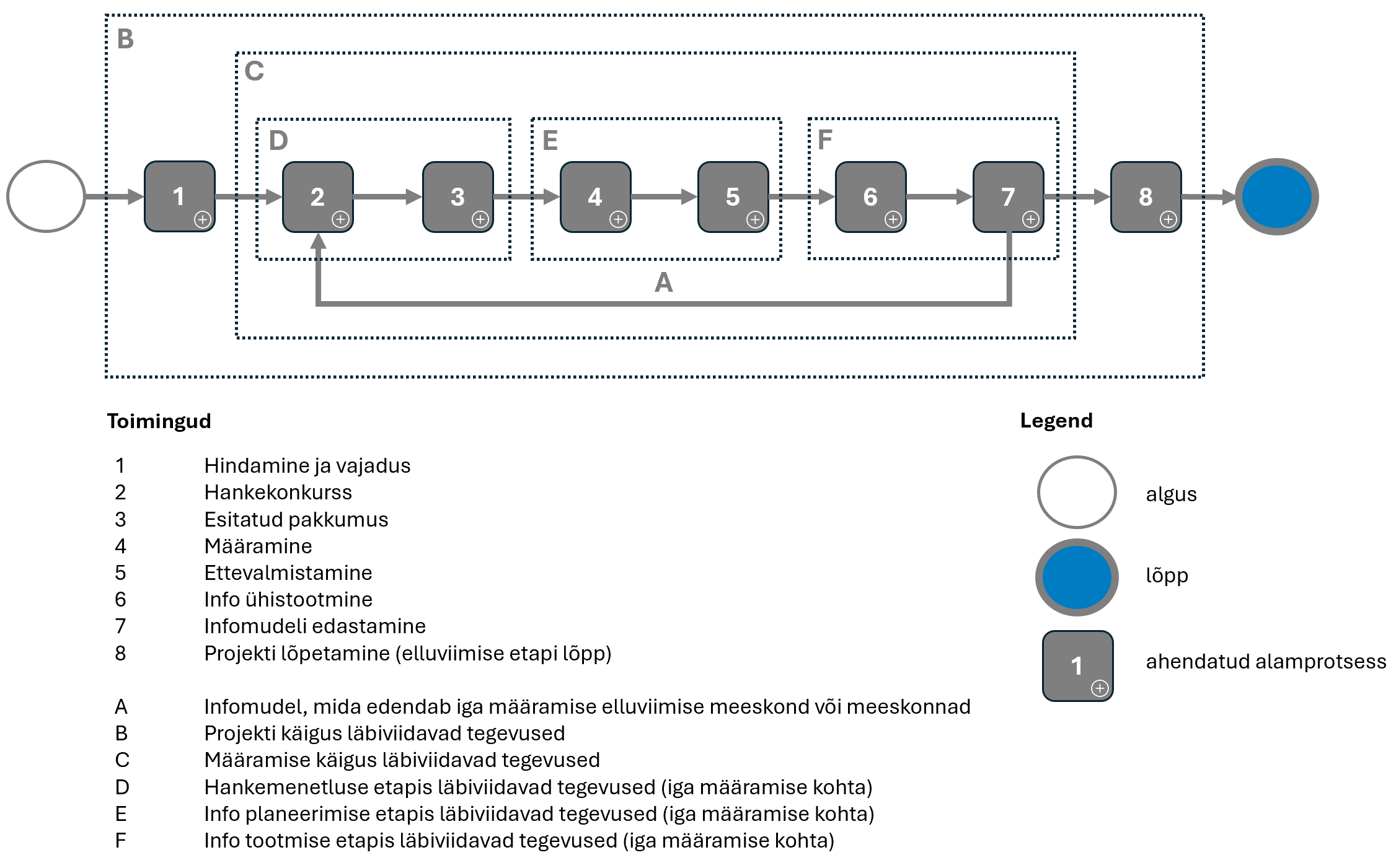 Joonisel toodud toimingute järjekord kajastab nende läbiviimise järjekorda. Osaliselt on kasutatud numeratsiooni esimese osana ka EN ISO 19650-2 standardi peatükki numbrit, seega joonisel toodud etapid 1,2,3 jne võib vaadata ka kui 5.1, 5.2, 5.3 jne.