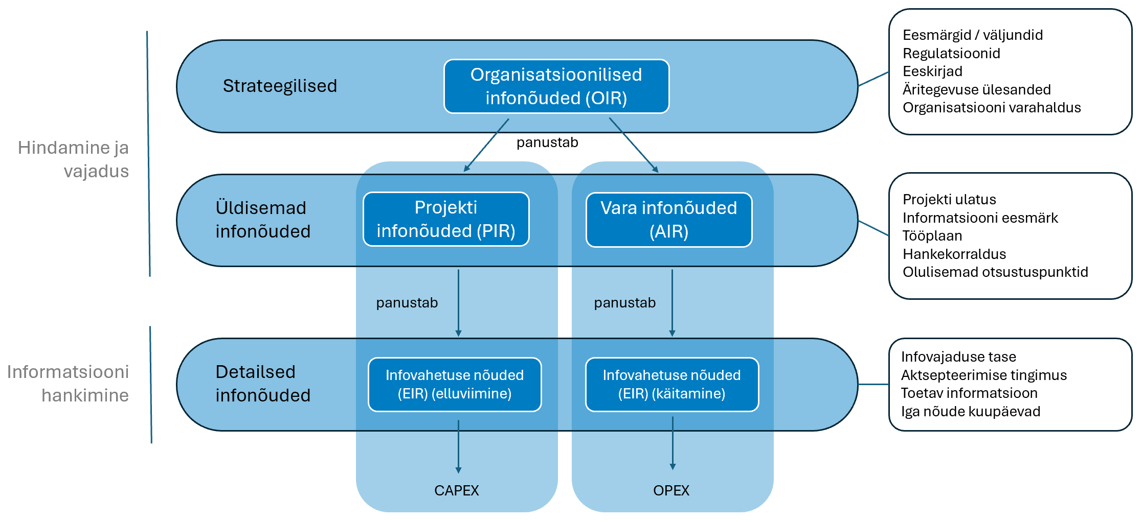 Joonis. Infonõuete ressursid. CAPEX - capital expenditure (vara ostmiseks, paigaldamiseks ja kasutuselevõtuks kasutatud investeering). OPEX - operating expenditure (käitamiseks ja korrashoiuks kasutatud kulud, sealhulgas seotud kulud, nagu logistika ja varuosad).