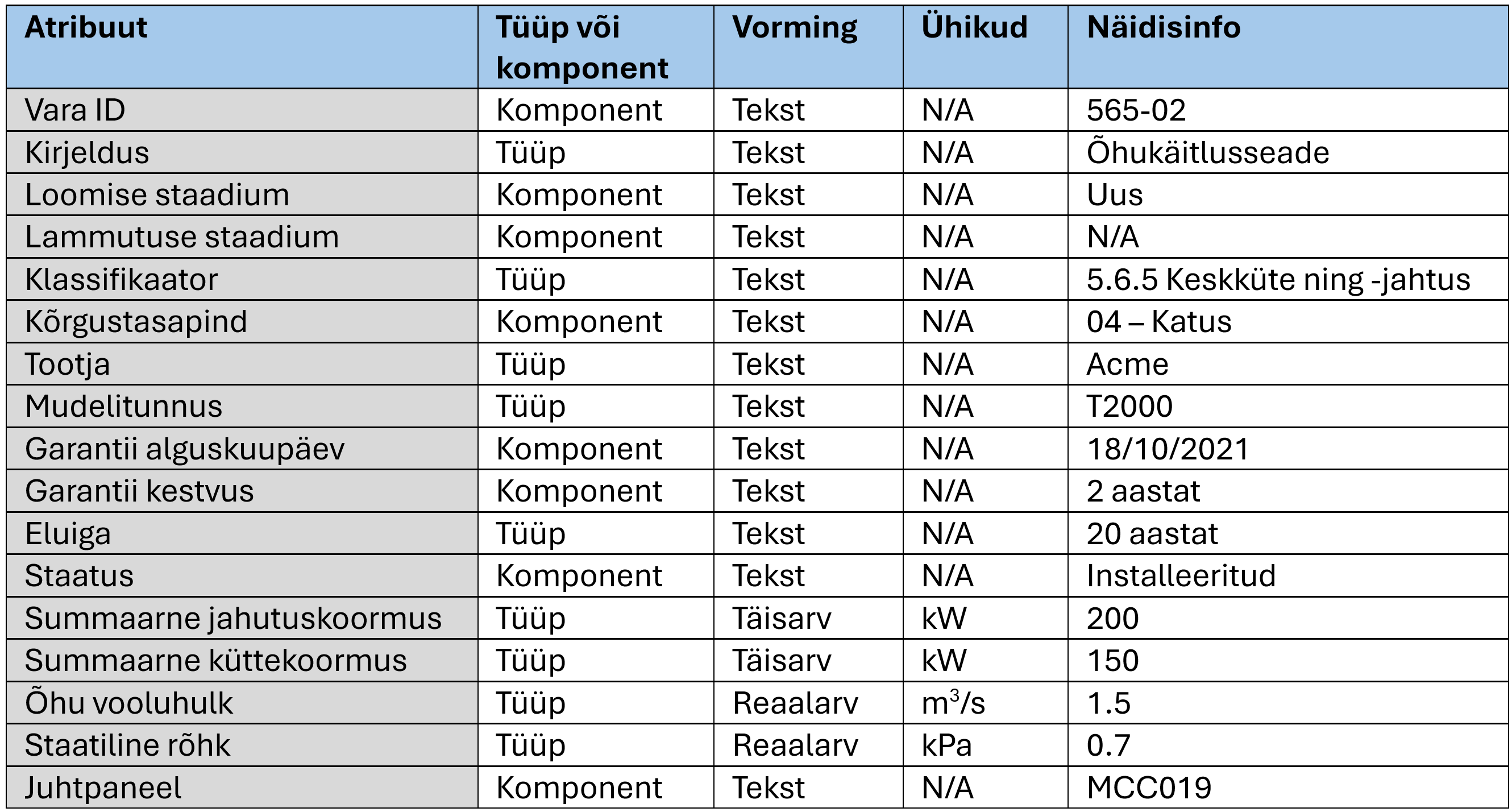 - Oluline on määrata atribuudi vorming. Tekstiväärtustega on lihtne, kuid nagu arvutustabelite puhul, tuleb need arvutuste tegemiseks (nt kõikide 200 kW summaarse jahutusvõimsusega AHU-de filtreerimiseks) teisendada sobivasse andmetüüpi.