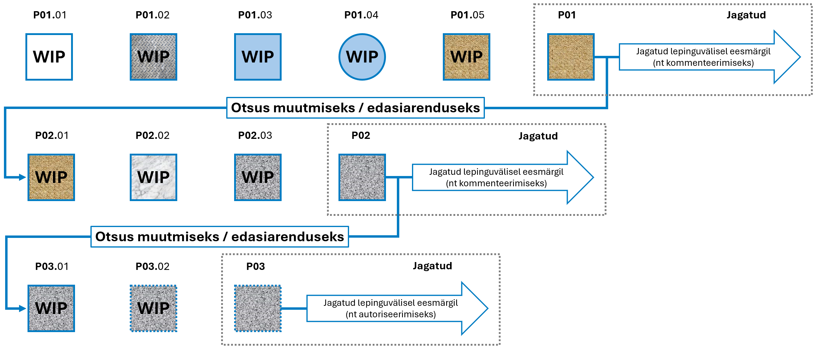 On oluline, et läbivaatamise süsteem kohandaks järjekindlalt seda iteratiivset lähenemist, mis hõlmab mitut töösolekut (WIP) ja jagatud versiooni ühe infokonteineri ulatuses. Joonis esitab protsessi pärast WIP ja jagatud informatsiooni esimest läbimist, illustreerides informatsiooni arendamise kahte täiendavat iteratsiooni.