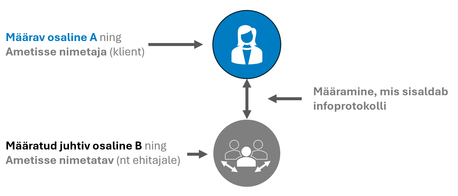 Näide. Määramine võib toimuda määrava osalise (osaline A kui klient) ja ehituse jaoks määratud juhtiva osalise (osaline B) vahel, nagu on näidatud alloleval joonisel. Selles kokkuleppes: