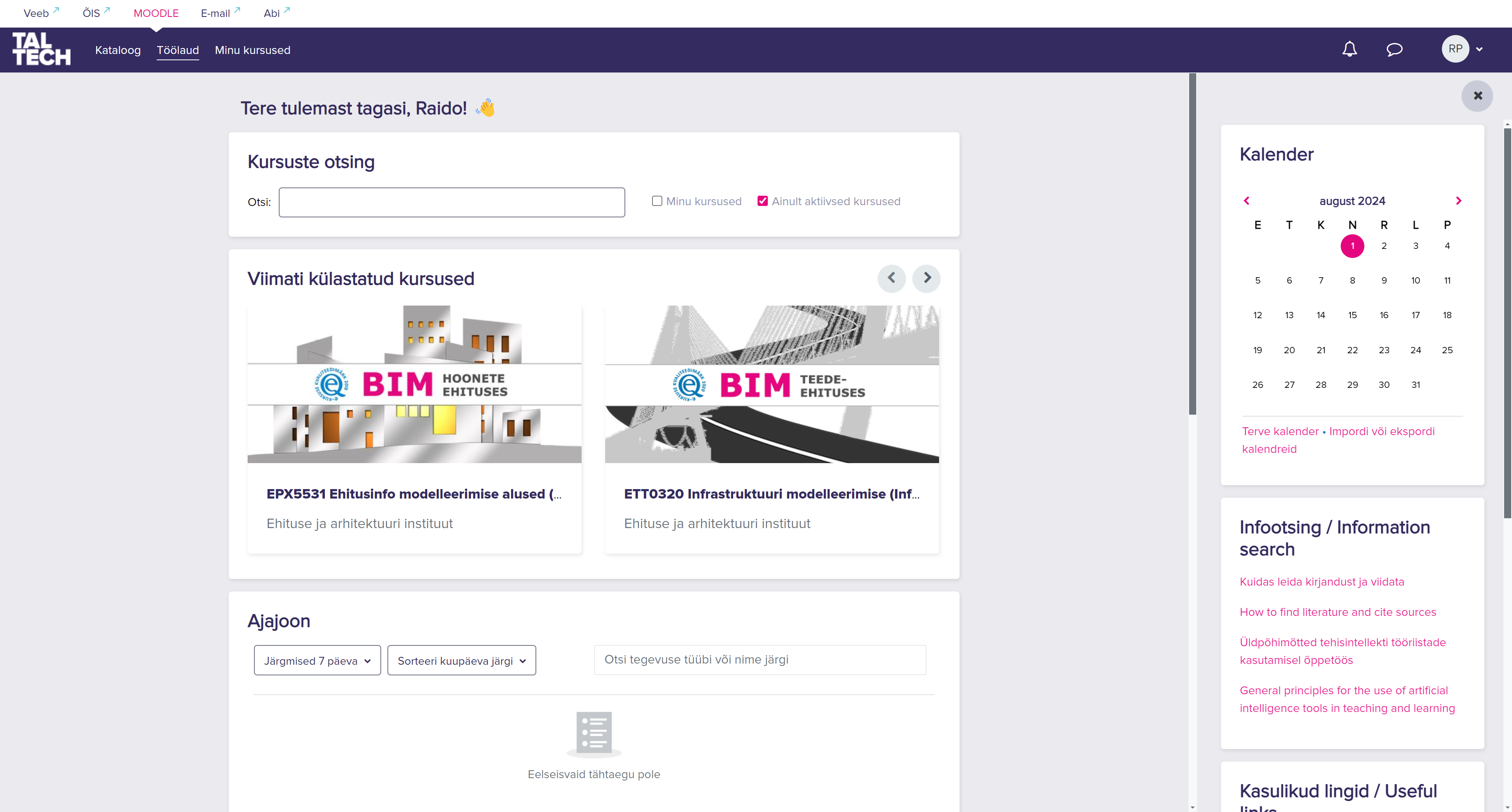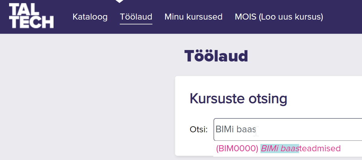 Pane tähele, et avaleht sõltub ennekõike sellest, millistele kursustele oled registreerunud. Osad kursused võivad olla külalistele avatud, osad jällegi mitte. Antud BIMi baasteadmised on külalistele avatud, kuid see ei tähenda, et oled automaatselt registreerunud. Peale konto loomist võid otsida "BIMi baasteadmised" kursust ülemise otsingukasti kaudu (aga võid kasutada ka otselinki kui see on Sulle näiteks e-kirjana saadetud - olles eelnevalt aktiveerinud Moodle konto).