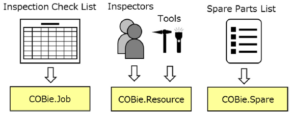 - COBie.Resource - kirjeldab korrashoiuks vajalikke materjale ning inimressursse; samas kui korrashoiuks vajalik varustus on lisatud COBie.Job alla;