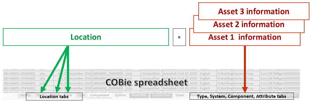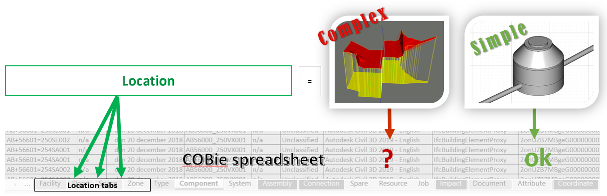 COBie esitab iga komponendi asukoha. See on mõistagi oluline, et määratleda komponendi paigutust. COBie standardtne lähenemine on, et ruum kui selline on jagatud vertikaalseteks kihtideks, mis esitavad korruseid, ruume ning seintega eraldatud liikumisteekondi. Samas kui tunnelite ja sildade puhul on ennekõike määravaks nende pikkus, mis on infrastruktuuriga seotud objektide üks iseloomulikumaid jooni, erisusi - need on (pikad) lineaarsed objektid (ning hooneid nimetatakse üldjuhul vertikaalseteks konstruktsioonideks). Seega, kuidas saaks laiendada Facility, Floor, Space ning Zone tähendust infrastruktuuri objektidele?