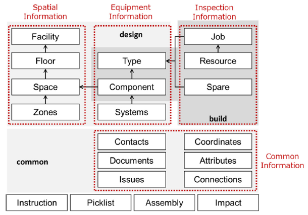 COBie tabelite struktuuri saab jagada ruumiliseks kirjelduseks (ingl spatial), komponentidega seonduvaks (ingl equipment), korrashoiuga seotud informatsiooniks (ingl inspection) ning üldiseks informatsiooniks (ingl common).